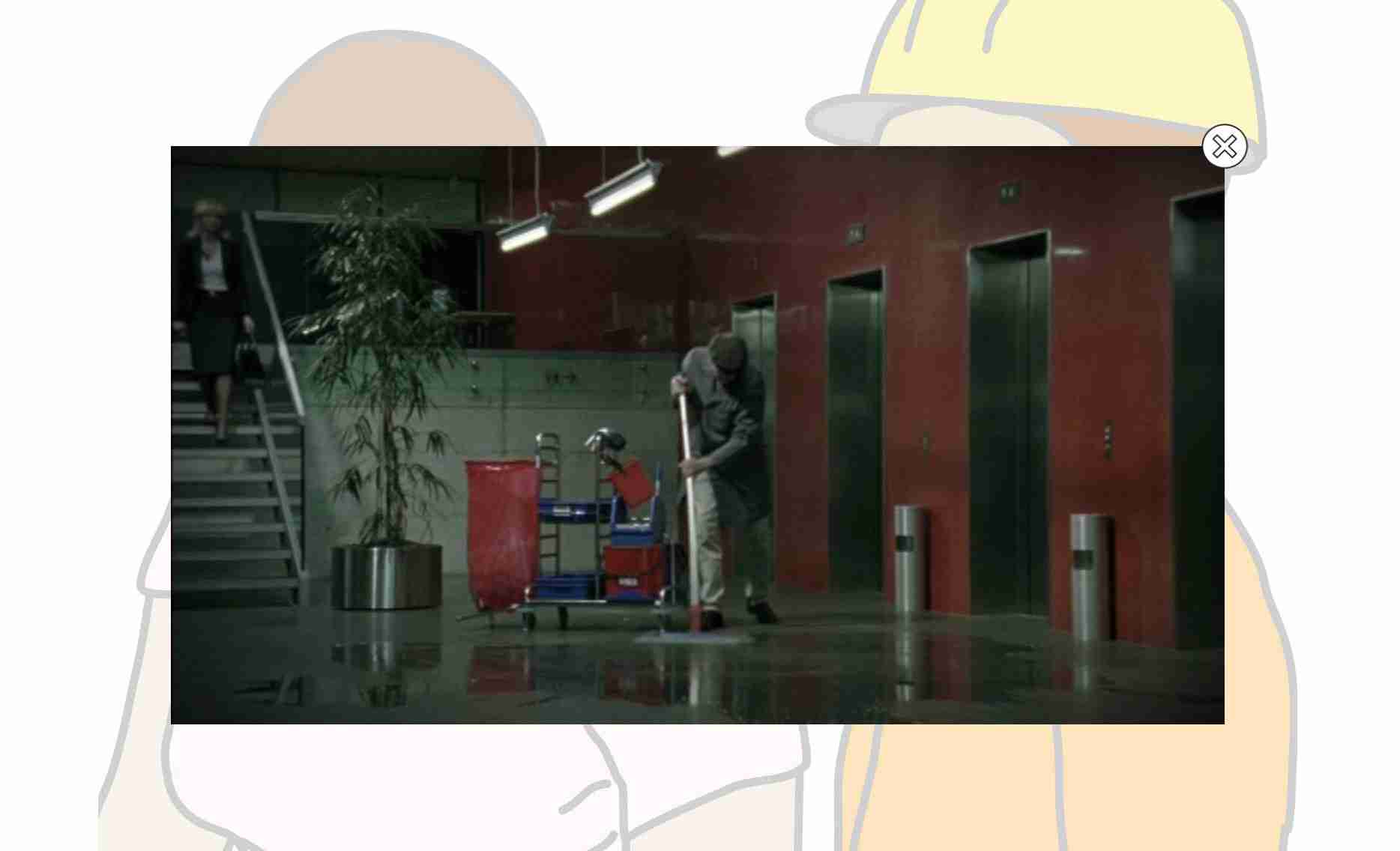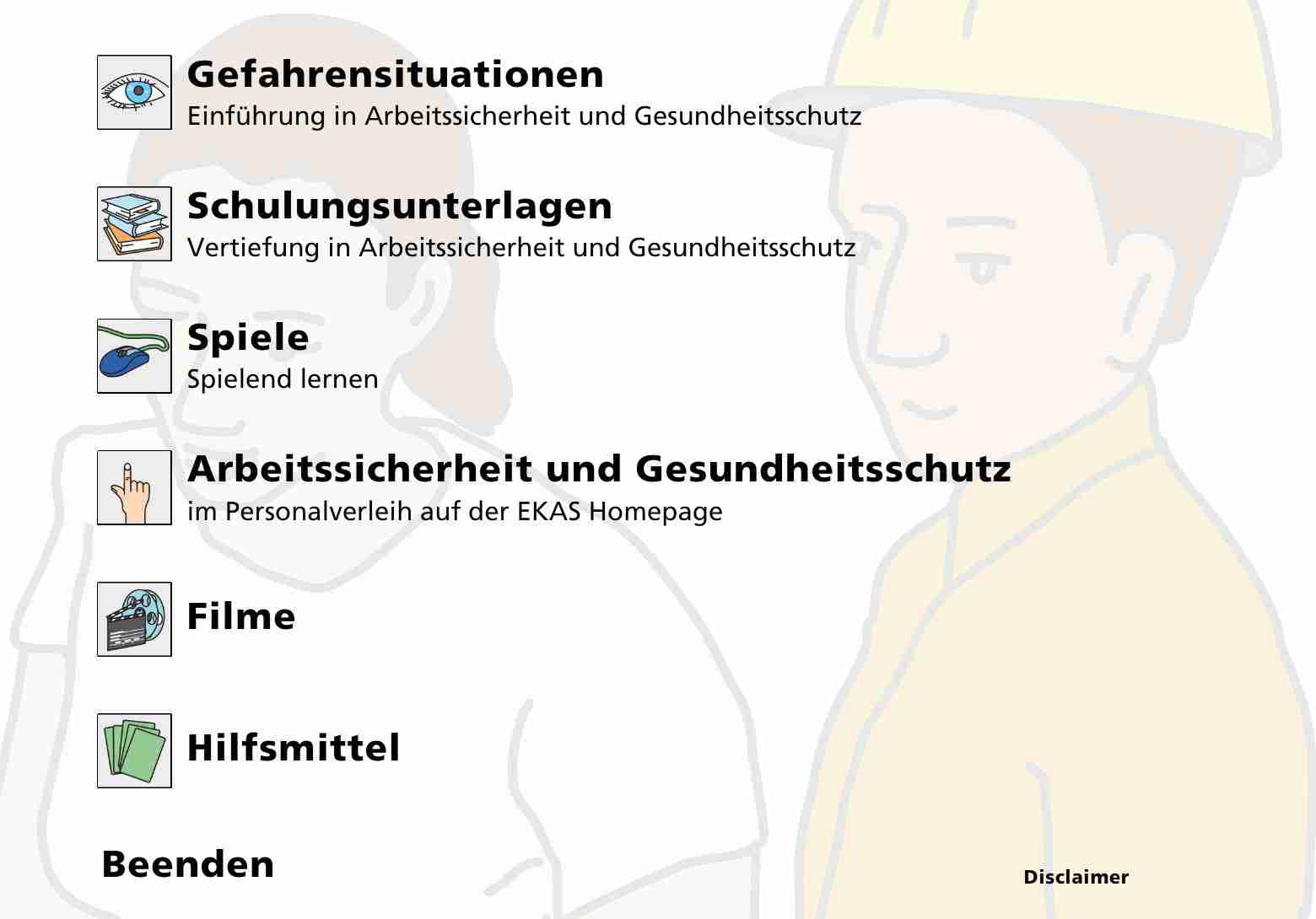 All hazardous situation (currently 60) of the branches "construction", "industry/trade" and "services" are documented with two images:Correct-Incorrect. Each situation allows to add spoken information or texts. In addition, an I-button (information button) facilitates to view, hear, process, print or download pre-selected documents - according to the hazardous situation- or media or films or learning programms (web based training) via links from the internet as well as instructions or comments.