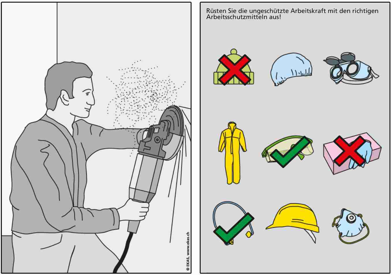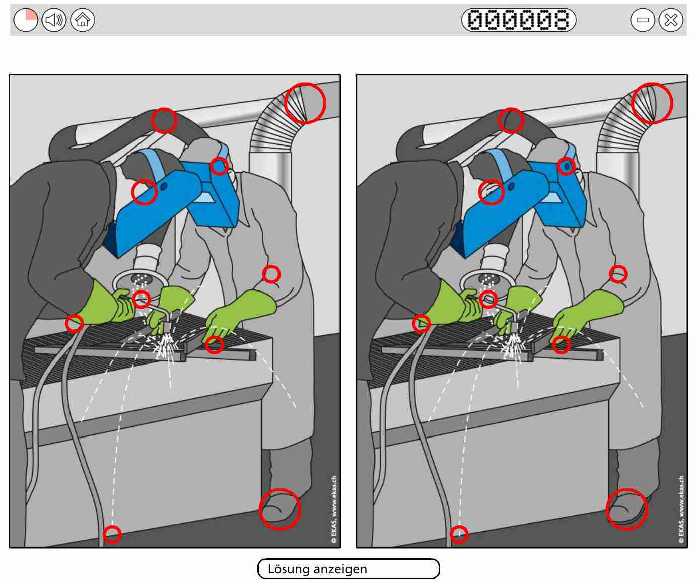 The target is to communicate fundamental occupational safety rules in a simple and comprehensible manner. As electronic prevention instrument it is better suited to reach the target groups as printed documents and in addition offers more opportunities to use. The "Slideshow" is available as DVD or can be downloaded from the website of the EKAS free of charge. At the core of the new instrument are illustrated danger situations which are presented as correct-incorrect. Different options exist (see background information)