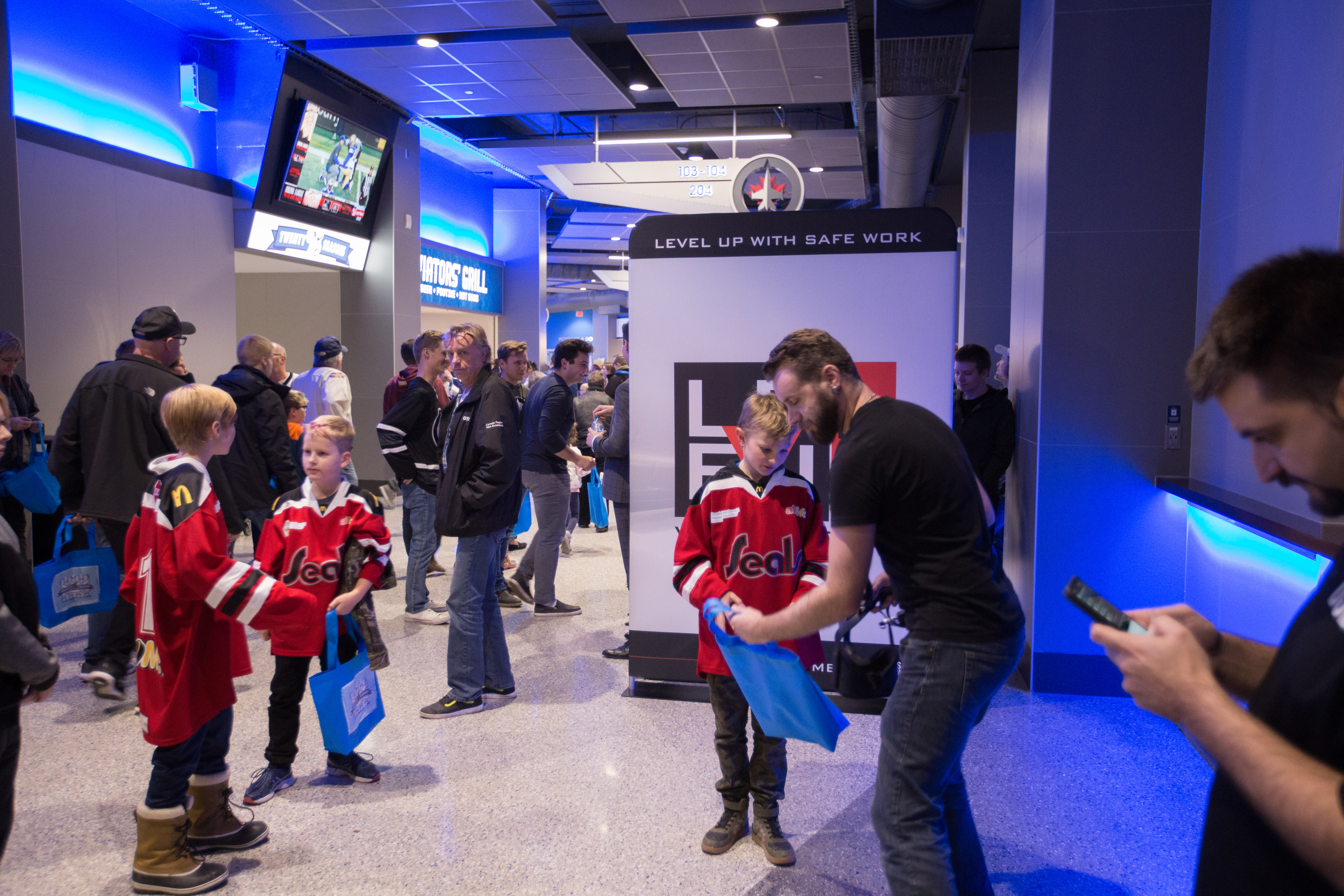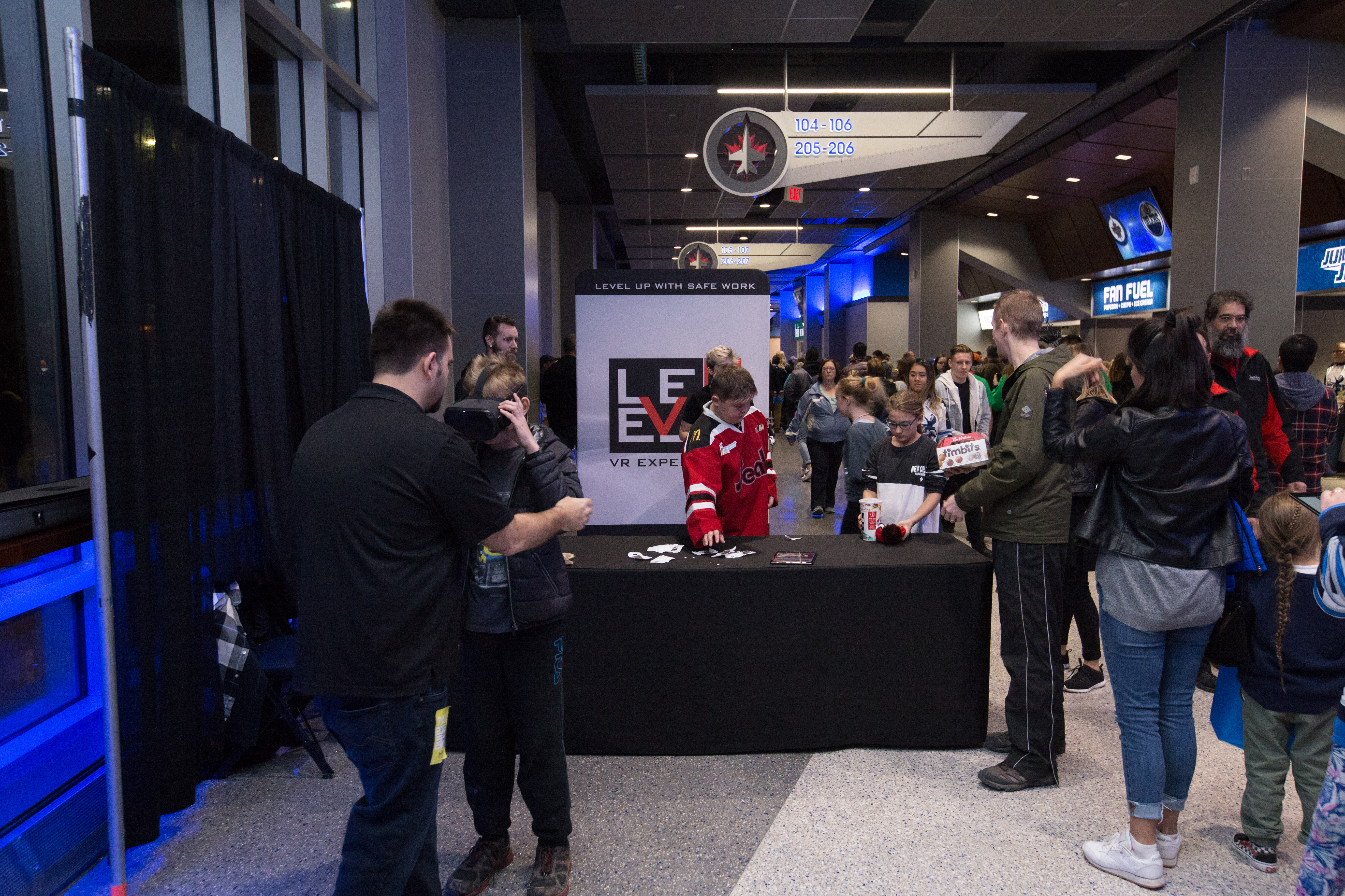 Pop-up booths offered people the full, hands-on experience of the Level Up 2.0 VR game. The booths were set up at movie theatres, malls, and Bell MTS Place (during a Manitoba Moose AHL hockey game)—all venues that we secured and coordinated. We promoted the VR booths through social media and the website, and enticed people at each location to participate in the VR experience by offering SAFE Work-branded phone pop-sockets or movie tickets. Each booth had about 50 – 100 youth try the VR simulation in a four-hour period.