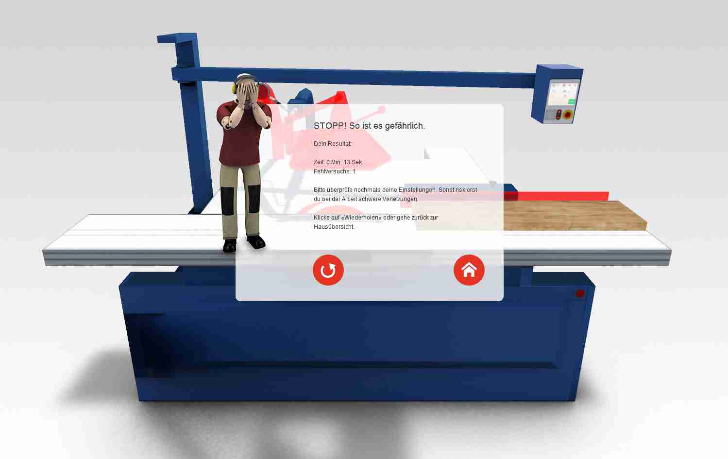 The dummy "Risky" shows the viewer on a virutal tour through the training center of Suva which risks are linked to the machines have to be observed and what will happen neglecting safety at work. "Risky" demonstrates how this may lead to serious accidents. And he also instructs how to carry out the works safely and efficiently.