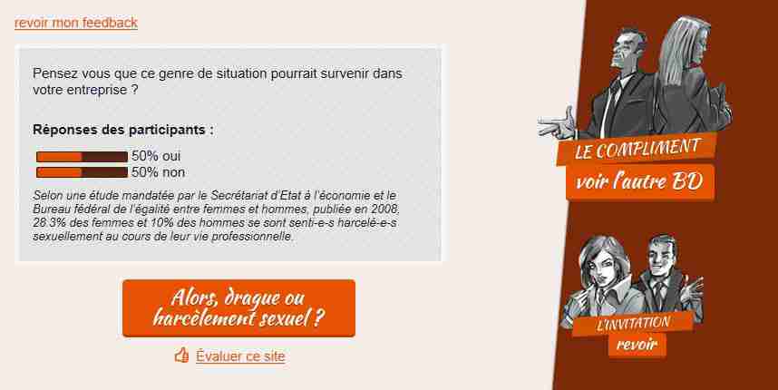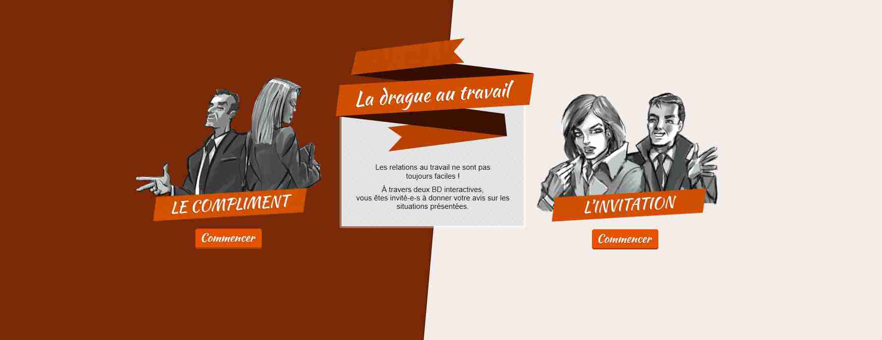 The website www.ladragueautravail.ch is a project for the prevention of sexual harassment at work. This fun tool, which is easy and freely accessible, aims to educate companies (including the direction, HR managers, executives and employees) on the concept of sexual harassment and thus attempts to prevent such discrimination. Through two interactive comics and a quiz, the website allows to test your knowledge of sexual harassment and also offers a self-assessment of the measures taken by companies, allowing the companies to test their compliance with the Swiss law. This project has received financial support from the Federal Office for Equality between Women and Men.