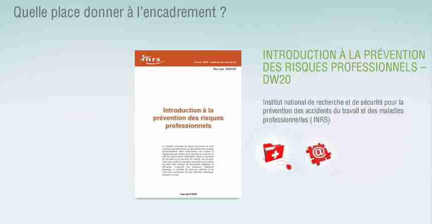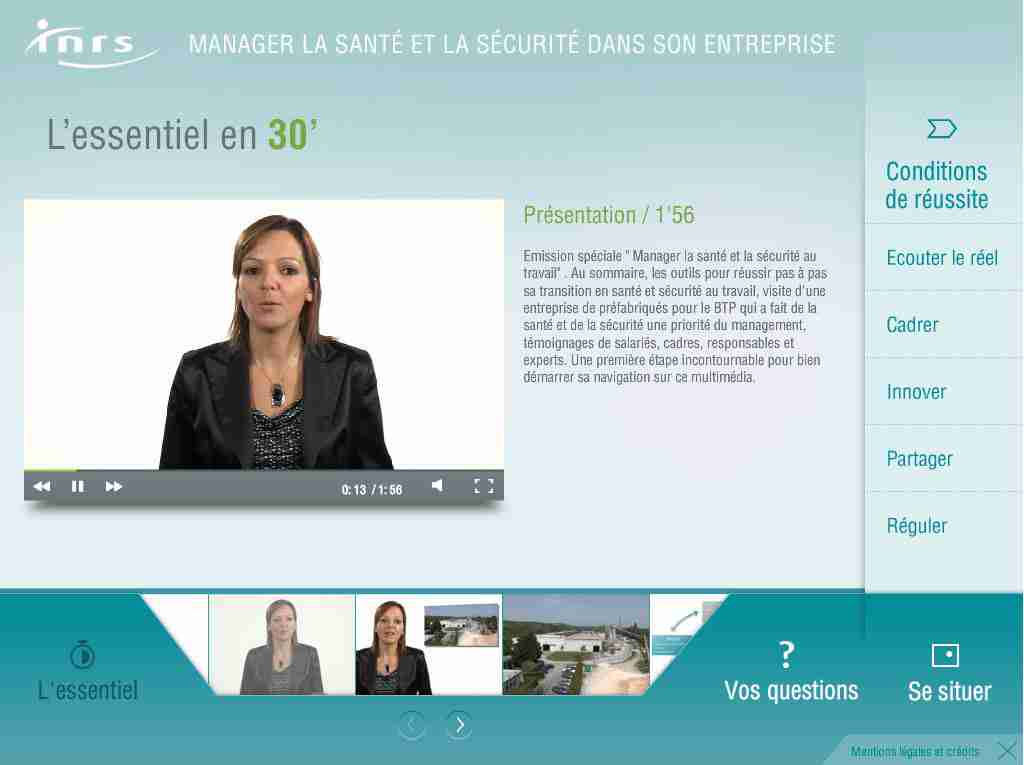 This tool offers a range of varied resources, contents and diverse forms: . three reports in companies which have integrated questions on health and security in their management. They present each company (a foundry, a company of prefabrications for BTP (Bâtiments et Travaux Publics), an industrial man specialized in powder compression), its approach, the actors involved, the issues, any difficulties. . the actors’ testimonies of the approach to health and security which develop the different conditions of success: “innovate, share, regulate” while sharing their experience (actions, satisfactions, benefits, brakes…). . expert judgements presenting advice, concepts and tools in order to put into place a management of health and security. . tools, brochures, references to the relevant websites… made available in order to complete the information of the video resources. Several modes of navigation are proposed: . “The essential”: a course of less than 30 minutes presents an overview of issues . “Your questions” . “Conditions for success” when implementing the health and security management. “Locating”: panorama of all resources provided: broadcast stories, interviews, experts voice, animation, documents and links to Internet sites.