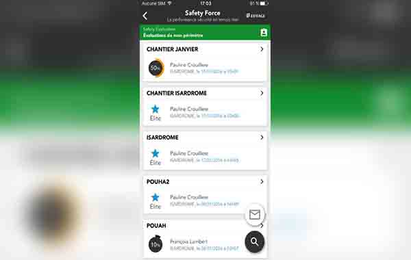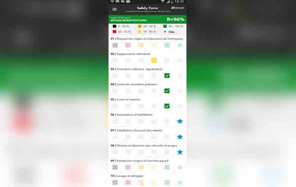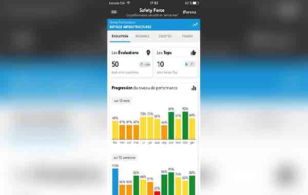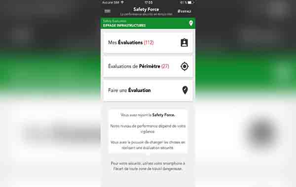 SAFETY FORCEĀ© is a mobile application designed by Eiffage Infrastructures. This tool identifies and measures upstream safety performance indicators in real time. The application operates as part of a network to assess the effectiveness of safety measures and employees' ability to follow the branch's twenty fundamental safety requirements on a site-by-site basis, thereby helping to gradually achieve 100% safety at every location. SAFETY FORCEĀ© is fully based on the operational aspect of risk prevention, i.e. the production sites, where the practical and concrete realities of safety occur every day.