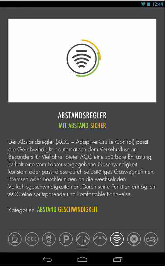The app is to create more awareness of safety aspects and benefits of advanced driver assistance systems (FAS) and support the purchasing decision for more car safety. In addition, the app is designed to give drivers an insight into the future of car safety with driver assistance systems.