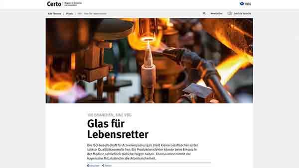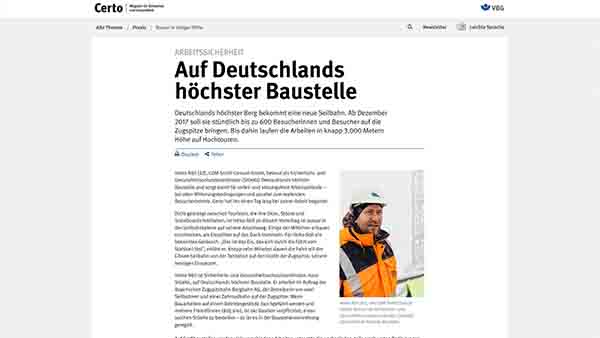 Certo - The magazine for safety and health has two central functions: on the one hand, the customer magazine should work as an important image publication and it should position the VBG as a modern service company and as a partner of the member companies. On the other hand, VBG's member companies are to be bound to the Berufsgenossenschaft as satisfied customers. Certo is the door opener to VBG's world of performance.