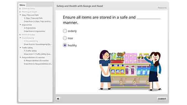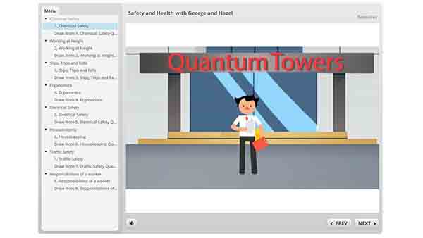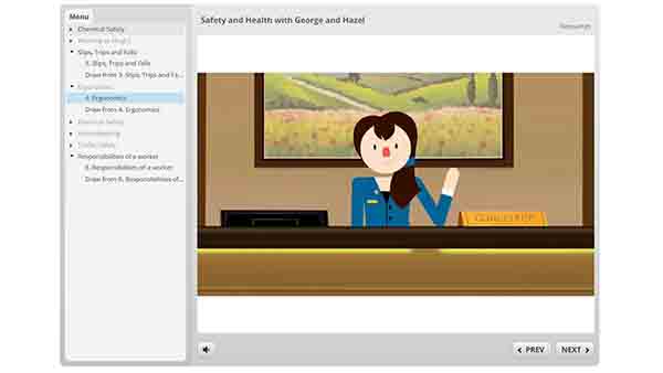 An e-learning animation following the daily work lives of George and Hazel and teaching users the basics of workplace safety and health.